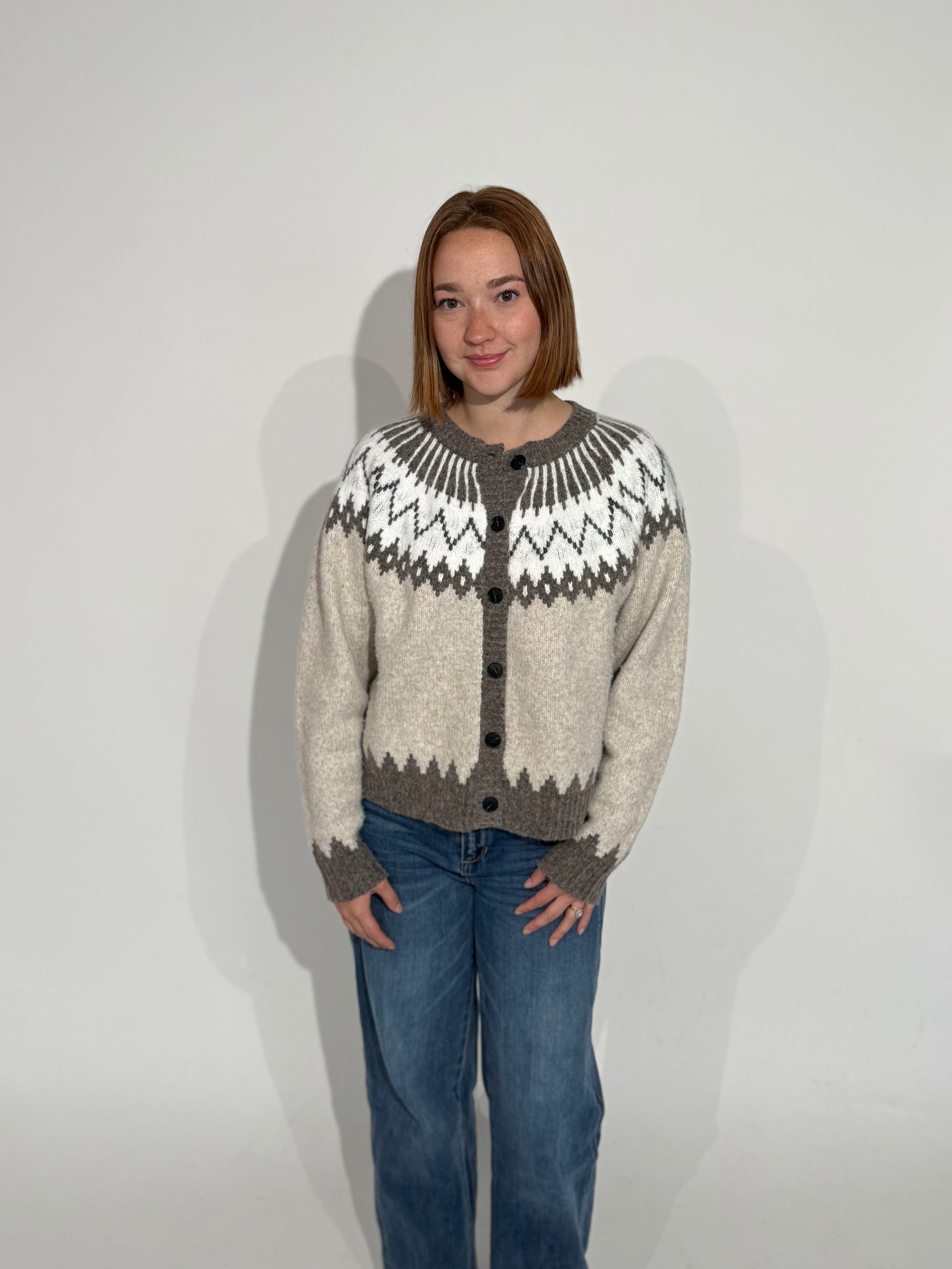 The Aurora Cardigan is an oversized, ultra-soft Fair Isle knit designed to bring a touch of classic winter charm to your wardrobe. Crafted with a warm mocha base and accented with light grey, charcoal, and white detailing, it offers a fresh, modern take on a timeless alpine pattern. The exceptionally soft material and relaxed silhouette make it a piece you’ll reach for whenever you want comfort without compromising style. Cozy, elevated, and beautifully made, Aurora pairs effortlessly with denim, leggings, or your favorite basics for an instantly polished cold-weather look.