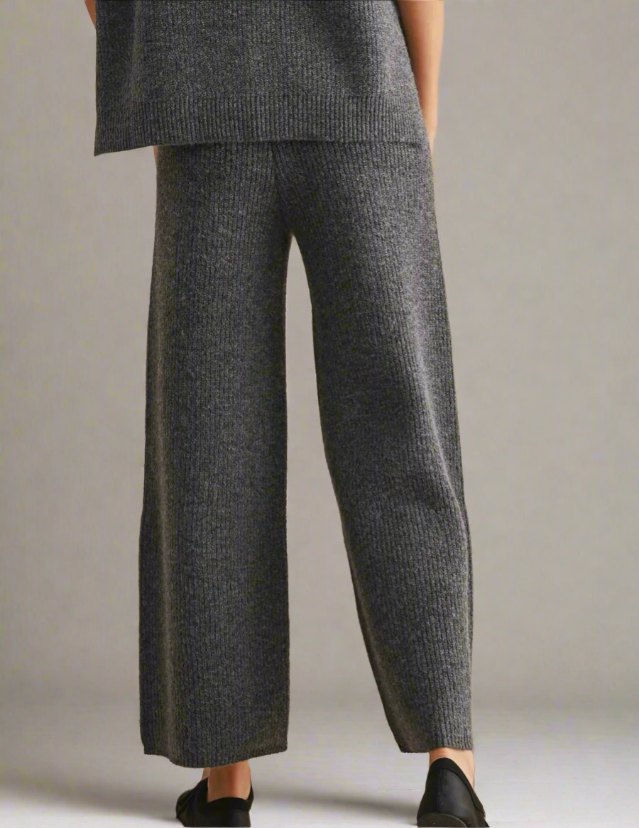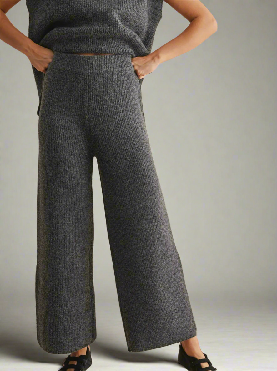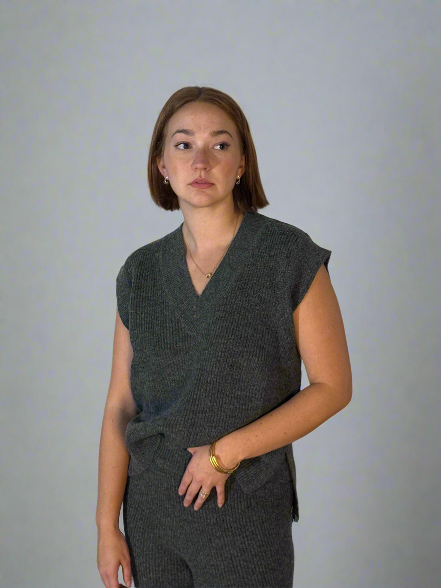 Effortless comfort meets elevated style in The Drift Set. Crafted from an ultra-soft, ribbed knit with beautiful stretch, this matching ensemble brings a refined take to lounge dressing. The V-neck sweater vest drapes with ease, featuring a slightly longer back for a flattering, relaxed silhouette. The coordinating ankle-length flared pants complete the look — perfectly balanced, endlessly comfortable, and polished enough to wear beyond home.