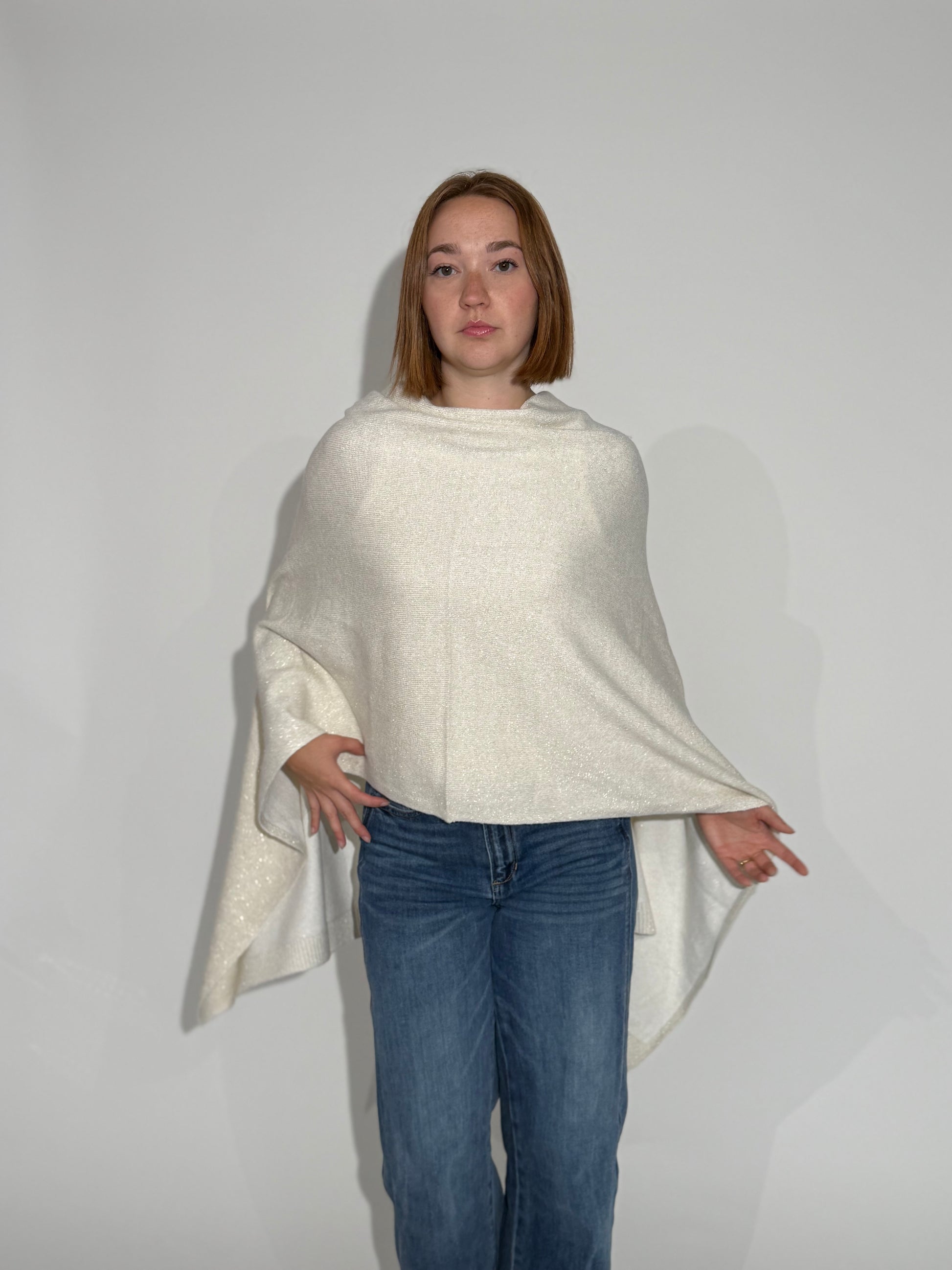 The Halo Poncho is a softly structured, high-low knit designed to bring effortless elegance to any winter look. Similar in feel to our Aura Poncho, Halo features a relaxed cowl neck and a beautifully draped silhouette that falls longer in the back for a flattering, elevated shape. Easy to style yet instantly polished, it pairs perfectly with denim for a chic everyday outfit or can be dressed up in a monochromatic look for a refined, modern moment. Cozy, timeless, and incredibly versatile — The Halo Poncho is a piece you’ll reach for season after season.
