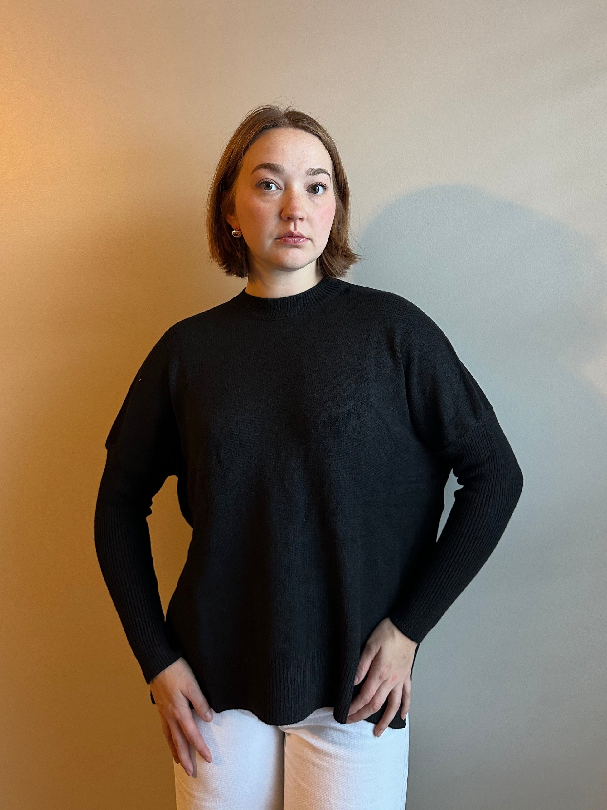 Proof that a classic doesn’t have to be basic. This all-black sweater redefines everyday dressing with a sleek, modern silhouette designed to do more than just keep you cozy. Featuring a more fitted sleeve through the forearm and a softly relaxed shape from the elbow up, it creates a subtle drape that feels effortless yet refined.