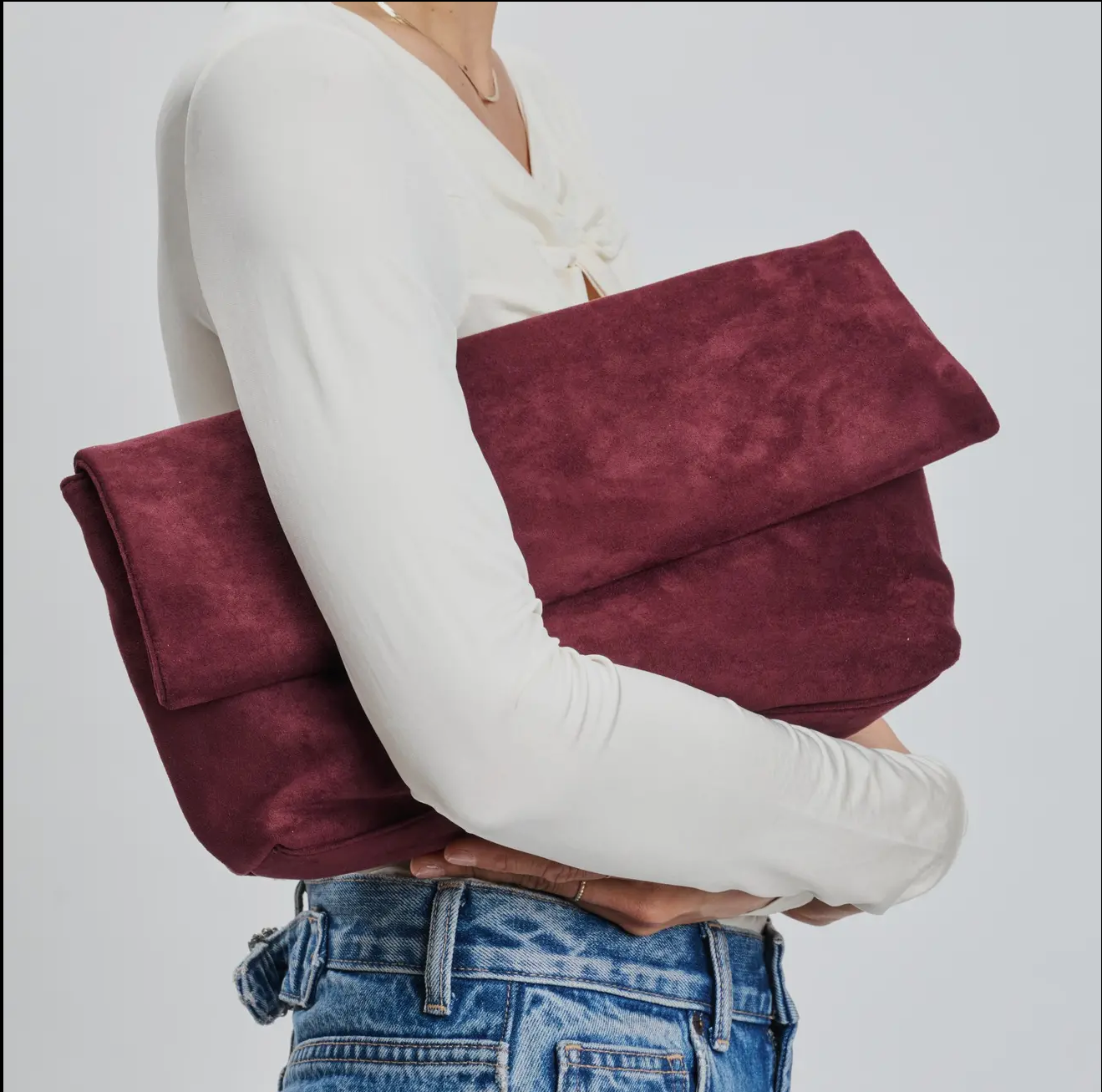 Meet The Angela Clutch — a rich, wine-toned statement piece crafted in genuine suede. This foldover silhouette feels effortlessly chic in hand, yet transforms into a practical crossbody with the included chain strap. The deep wine color makes it perfect for holiday gatherings, winter dinners, and any event where you want a touch of understated luxury. Sleek, soft, and beautifully made, The Angela Clutch is the kind of accessory that elevates every outfit with minimal effort.